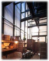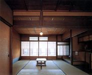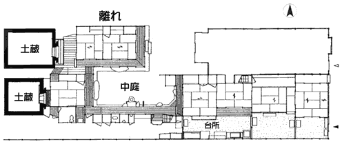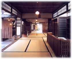 表の入り口から裏庭まで通じる土間は「通り庭」で、その台所部分が「走り庭」です。太い化粧木組からなる梁桁(はりげた)で構成された高い吹き抜け天井は「火袋(ひぶくろ)」と呼ばれます。井戸、流し、お竃、押し入れなどが備わっていて、昔の商家の様子がそのまま保存されています。母屋1階(京間34.5畳)