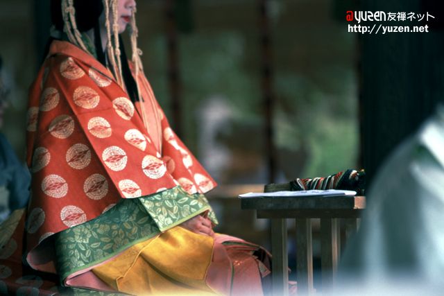 | ※画像をクリックしてみて下さい。拡大画像が表示されます。お使いのパソコンのデスクトップの壁紙などとしてお使い下さい。数字は画像サイズです。ダウンロードの際の、目安にどうぞ。 9月9日は重陽の節句。 天皇以下、貴族たちが紫宸殿に集まり、歌を詠んだあと、菊酒を飲んだりしました。菊は古くから延寿に効果があるといわれ、花びらをいれた菊酒や、菊の香りを染み込ませた菊綿で体を撫でたりしたそうです。平安時代に始まったこの宮廷行事が、のちに普及していろいろな行事や催しが行われるようになりました。上賀茂神社の重陽神事もそのうちの一つです。 神事そのものはショーとしてではなく、正式な神事として本殿内部で行われるため、カメラ撮影はもちろんだめで、内部もはっきりとは見ることができませんが、菊の花に綿を覆い被せた「菊の被綿(きせわた)」を神饌とともに神前にお供えをします。 それよりも集まった人たちの、目当てはその後の烏相撲です。本殿前には特設土俵が作られ、周囲にはテレビ局のスタッフ、プロ、アマのカメラマン、見物客など、かなりの人が陣取ります。 烏帽子、白張り姿の刀禰が、弓矢をもってピョンピョンと横飛びをしながら、土俵前の盛砂の前に出て、「カーカーカー」、「コーコーコー」と烏の鳴き真似をしたあと、東西にわかれた、まわし姿の小学生十数名が相撲を取ります。 元気いっぱいに相撲を取る児童たちに、見物客たちの大きな声援の中が飛び、見ていてとてもほほえましい行事です。 平安時代には、歴代の皇女(天皇の娘)が斎王(さいおう)として、この神社にお仕えになっており、烏相撲もご覧になったと伝えられています。斎王の制度が鎌倉時代に絶えてしまった後も、斎王のご覧になる席だけはきちんとしつらえて神事を行ってきました。平成3年には、葵祭の斎王代がこのお役をおつとめになることになって、実に800年ぶりに陪覧が復興しました。 ただ、暦の上では秋といっても、まだまだ残暑厳しく、斎王代さまにとってはなかなかの厳しいご任務です。団扇などで顔を扇ぐことも許されず、正装のまま長時間じっとしていなければならないのですから。 |