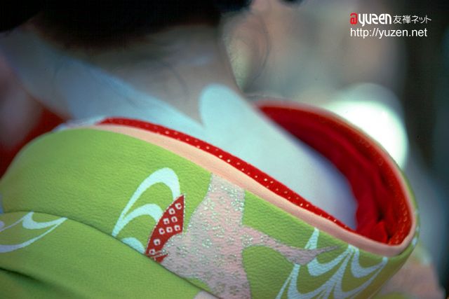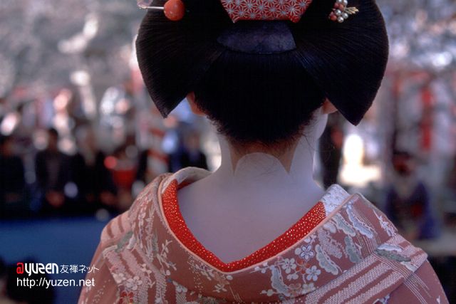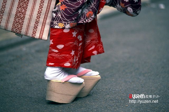 最近では、清水や嵐山あたりでは舞妓さんの衣装を着せてくれるお店とかもあって、結構な人気なのだとか。現在、ほんとうの舞妓さんを見ることが出来るのは、祇園界隈、宮川町、先斗町の通り、そして上七軒界隈です。夜がふける頃、ポック、ポックというおこぼの音を通りに響かせながら、お茶屋さんに向かう舞妓さんの姿はいつみてもいいものです。 |