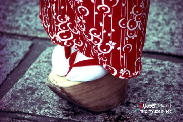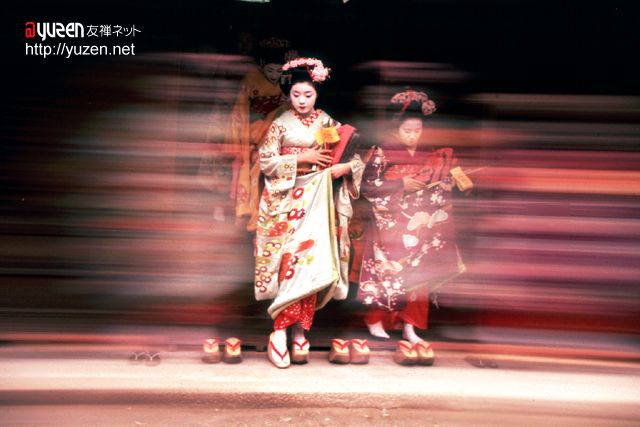 最近では、清水や嵐山あたりでは舞妓さんの衣装を着せてくれるお店とかもあって、結構な人気なのだとか。現在、ほんとうの舞妓さんを見ることが出来るのは、祇園界隈、宮川町、先斗町の通り、そして上七軒界隈です。夜がふける頃、ポック、ポックというおこぼの音を通りに響かせながら、お茶屋さんに向かう舞妓さんの姿はいつみてもいいものです。 |