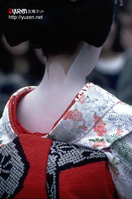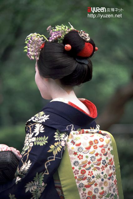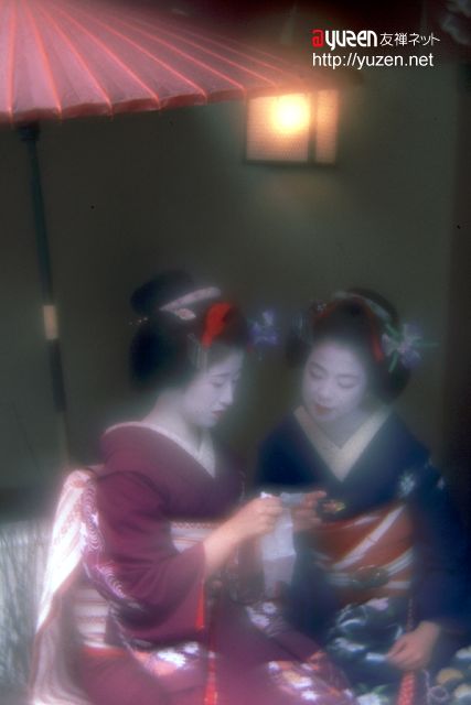 最近では、清水や嵐山あたりでは舞妓さんの衣装を着せてくれるお店とかもあって、結構な人気なのだとか。現在、ほんとうの舞妓さんを見ることが出来るのは、祇園界隈、宮川町、先斗町の通り、そして上七軒界隈です。夜がふける頃、ポック、ポックというおこぼの音を通りに響かせながら、お茶屋さんに向かう舞妓さんの姿はいつみてもいいものです。 |