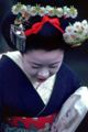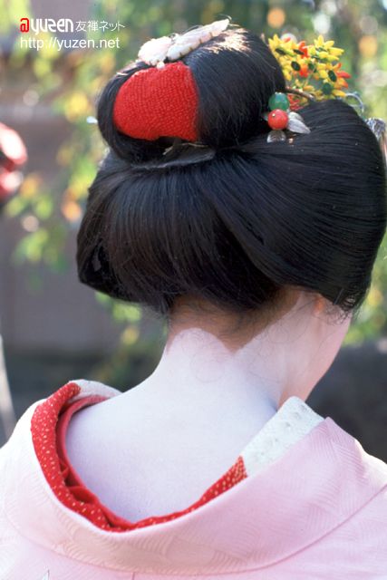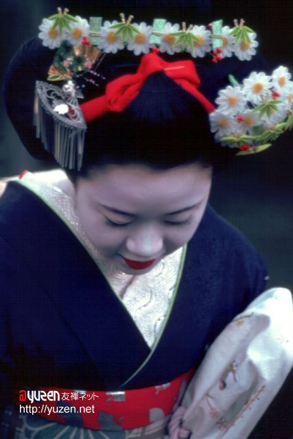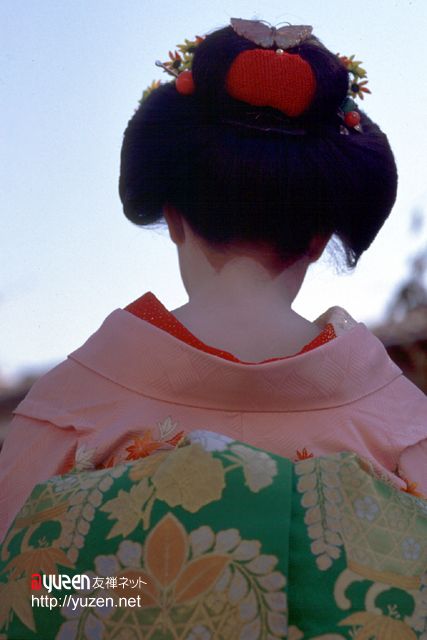 最近では、清水や嵐山あたりでは舞妓さんの衣装を着せてくれるお店とかもあって、結構な人気なのだとか。現在、ほんとうの舞妓さんを見ることが出来るのは、祇園界隈、宮川町、先斗町の通り、そして上七軒界隈です。夜がふける頃、ポック、ポックというおこぼの音を通りに響かせながら、お茶屋さんに向かう舞妓さんの姿はいつみてもいいものです。 |