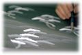 今この工房では、加藤さんと奥さんが仕事をするだけになっていますが、以前は多いときで7人のお弟子さんがいたといいます。今から30年ちかく前、昭和40年代のころまでは、京友禅にとってはこの世の春といえるような時期がありました。 ところが、時を経て、現在では京友禅全体の生産数でいえば当時の約10分の1、10年前と比較しても約3分の1といいますから、まさに様変わりです。業界全体が今、たいへんな苦難の状況になっていますが、なんといってもキモノづくりの一番の川上である職人さんたちの状況は深刻です。やむなく廃業して、他の職に付かざるを得ない職人さんたちも、決して少なくありません。加藤さんの知り合いのなかにも、そうしてやむにやまれず、やめていった人が大勢いるといいます。そんななかで、決して楽な生活とは言えないながらも、伝統の技をかたくなに守りつづけている加藤さんのような熟練の職人さんの存在はとても貴重です。