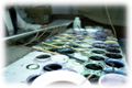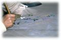 色挿しは、基本的には薄い色から濃い色へと進みます。今日使われる染料は、ほとんどすべてが合成染料ですが、その染料をそれぞれの職人の経験と感で適当に調合して、最も最適な色を作り出していきます。これ自体が実に神経のいる仕事です。