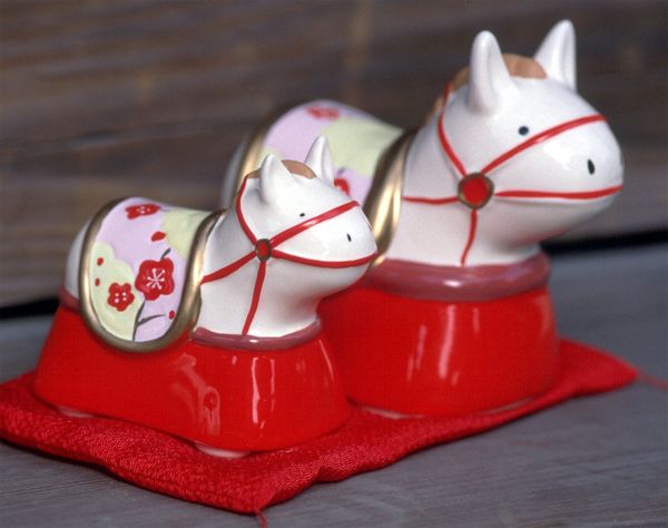 白馬の親子です。仲良く並べて飾ってあげてください。なかなか愛嬌のある顔をしてホッとさせてくれます。