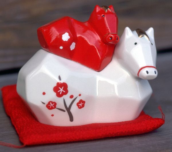 紅白親子馬セット 一つでも送料・振込手数料とも無料でお届けします! ※画像をクリックすると大きめのサイズでご覧頂けます 福を重ねる白い親馬と赤い子馬のセットです。仲良く並べて飾って頂いてもよいのですが、写真のように親馬の背中に子馬を乗せることもできます。実際の馬が子供を背負うことはありませんが、『福を重ねる』と言う意味で、招福グッズとしては大変縁起がいいものです。 商品コード: 32183 素材: 陶器 サイズ: 高さ約6cm 付属品: 座布団(ちりめんレーヨン) 1500円(税別) 数量: 1 2 3 4 5 6 7 8 9 ※紙の箱に入れてお届けします。ワレモノですので、万が一、破損して届いた場合には、着払いでご返送下さい。無償で至急交換致します。 [干支トップへ戻る] Copyright(c) 2001. All rights reserved by Channel Insight LTD.